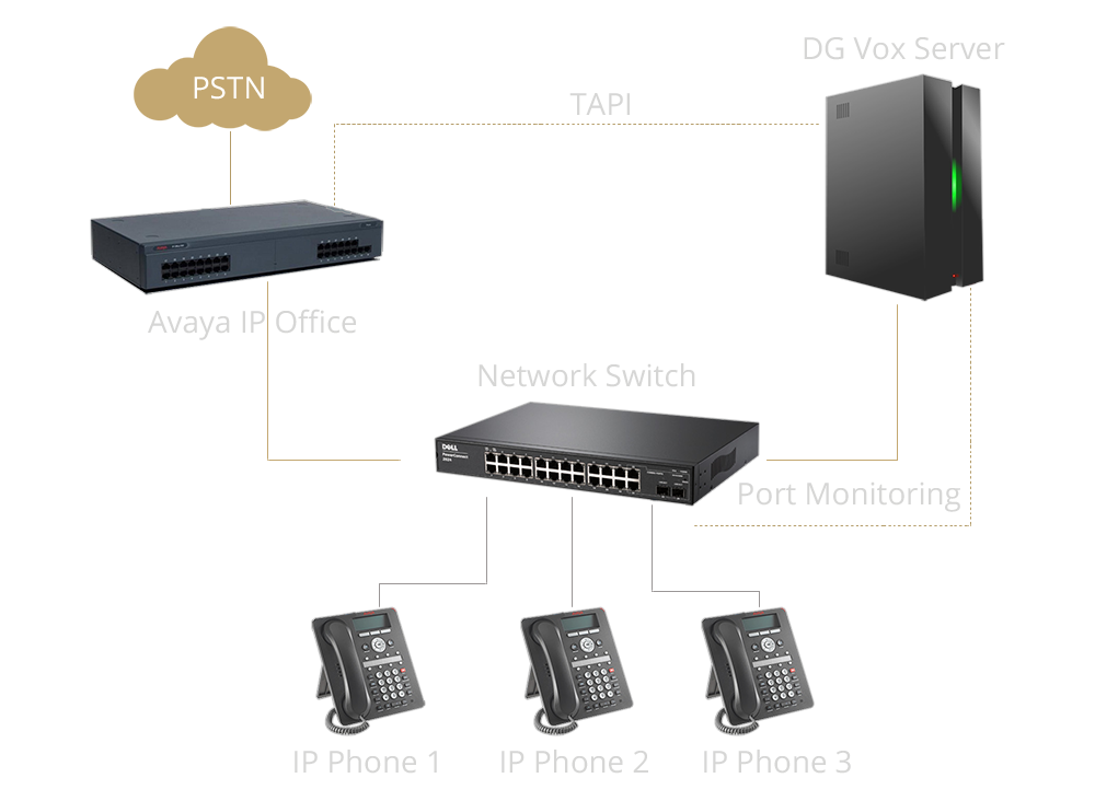 DGVox is integrated with multiple PBXsystems through a TAPI (Telephony API) link or CSTA link. Avaya IP office is integrated using the TAPI link . Unify is integrated through the CSTA link . This way more accurate and clear call related information will be captured and will be tagged with the call. Refer the Integrations page for more details.