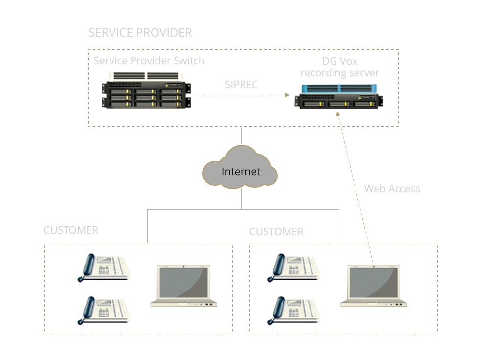 In a hosted environment DGVox recording server is located inside Service Provider's datacenter. Customers get access to own call recordings remotely via web-browser. Customer's data is isolated from each other.