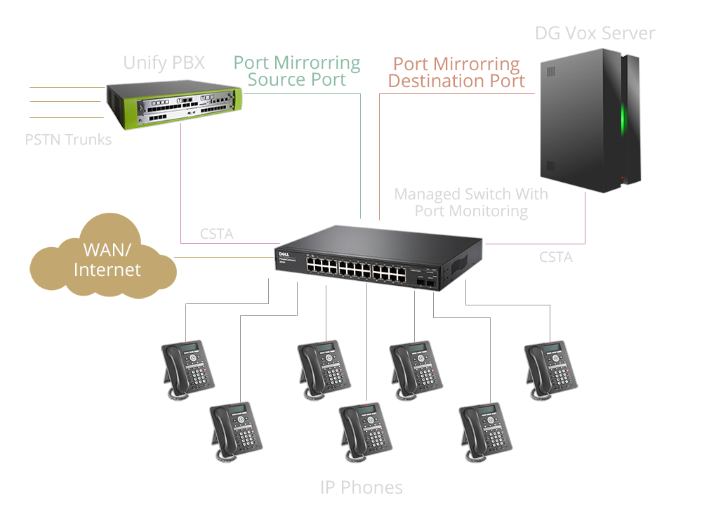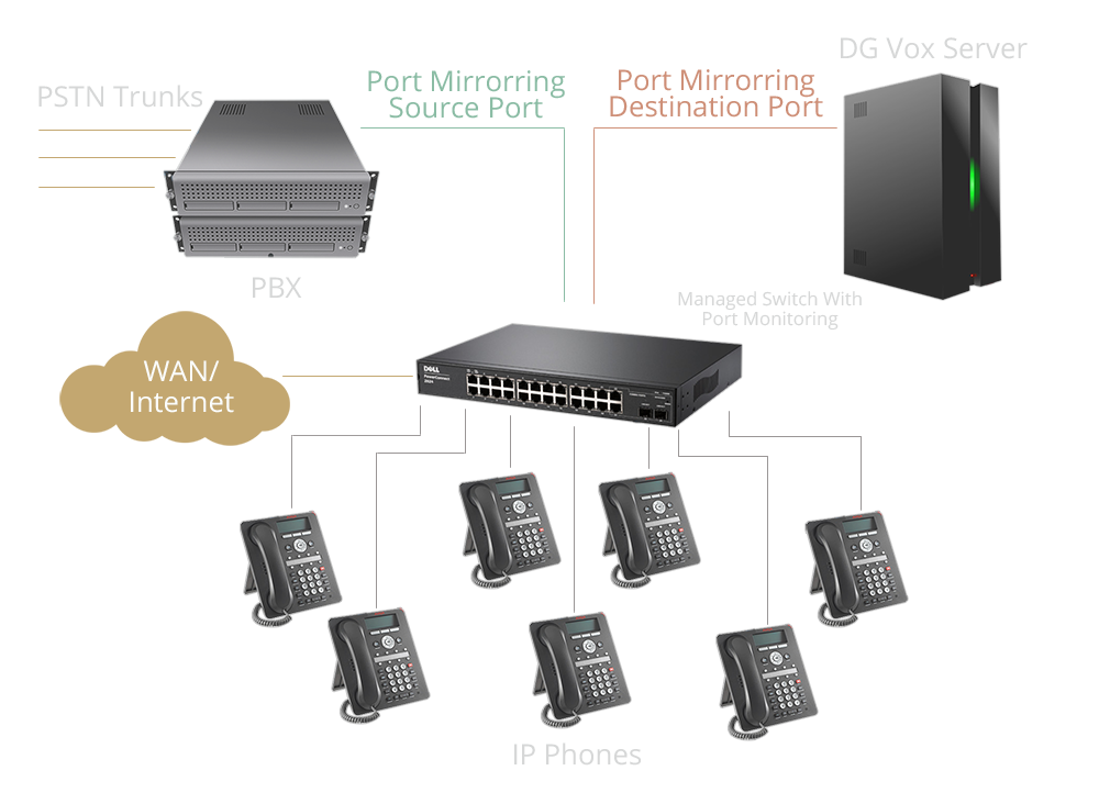 DGVox ‘s VoIP recording has two modes of operation, which are passive and active modes. In the passive mode of recording DGVox will listen to a SPAN port to which all the phones to be recorded will be mirrored and the resultant voice and data will be available to the DGVox’s LAN port assigned for recording the data.